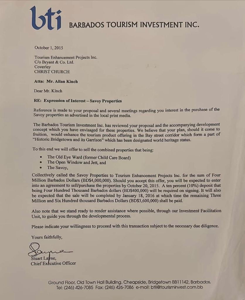 It was no secret what Mr Kinch intended to do with the land as plans had to be submitted with his tender document to BTII . BTII’s acceptance letter stated “The Barbados Tourism Investment Inc. has reviewed your proposal and the accompanying development concept which you have envisaged for these properties. We believe that your plan, should it come to fruition, it would enhance the tourism product offering in the Bay Street corridor which form a part of “Historic Bridgetown and its Garrison” which has been designated world heritage status.”